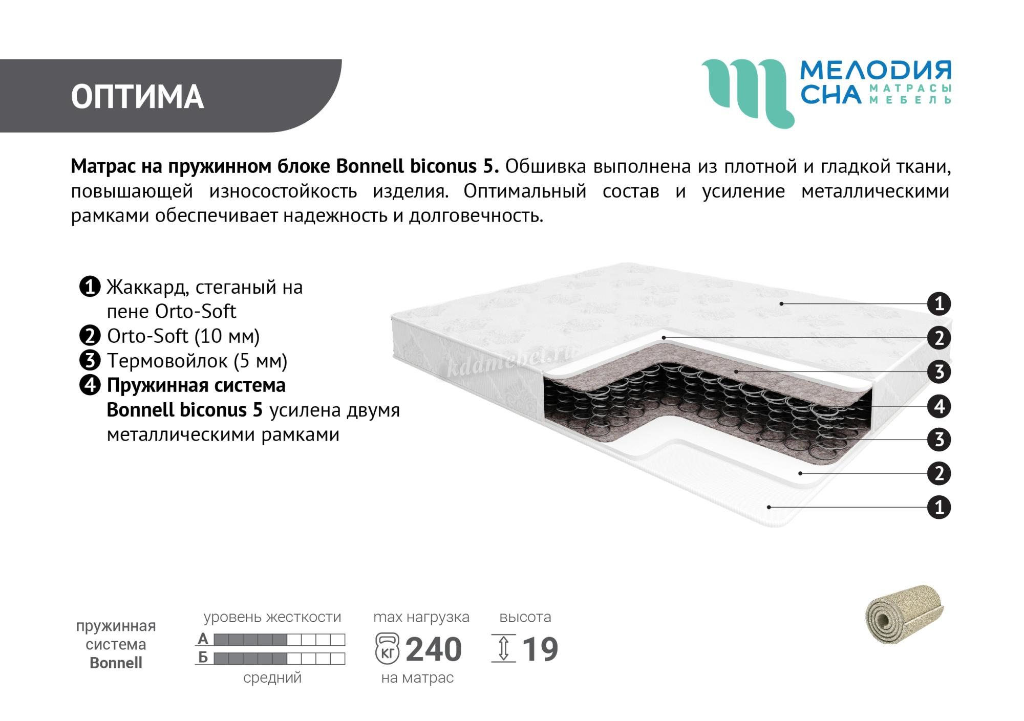 Матрас на пружинном блоке Bonnell biconus 5. Обшивка выполнена из плотной и гладкой ткани, повышающей износостойкость изделия. Оптимальный состав и усиление металлическими рамками обеспечивает надёжность и долговечность.