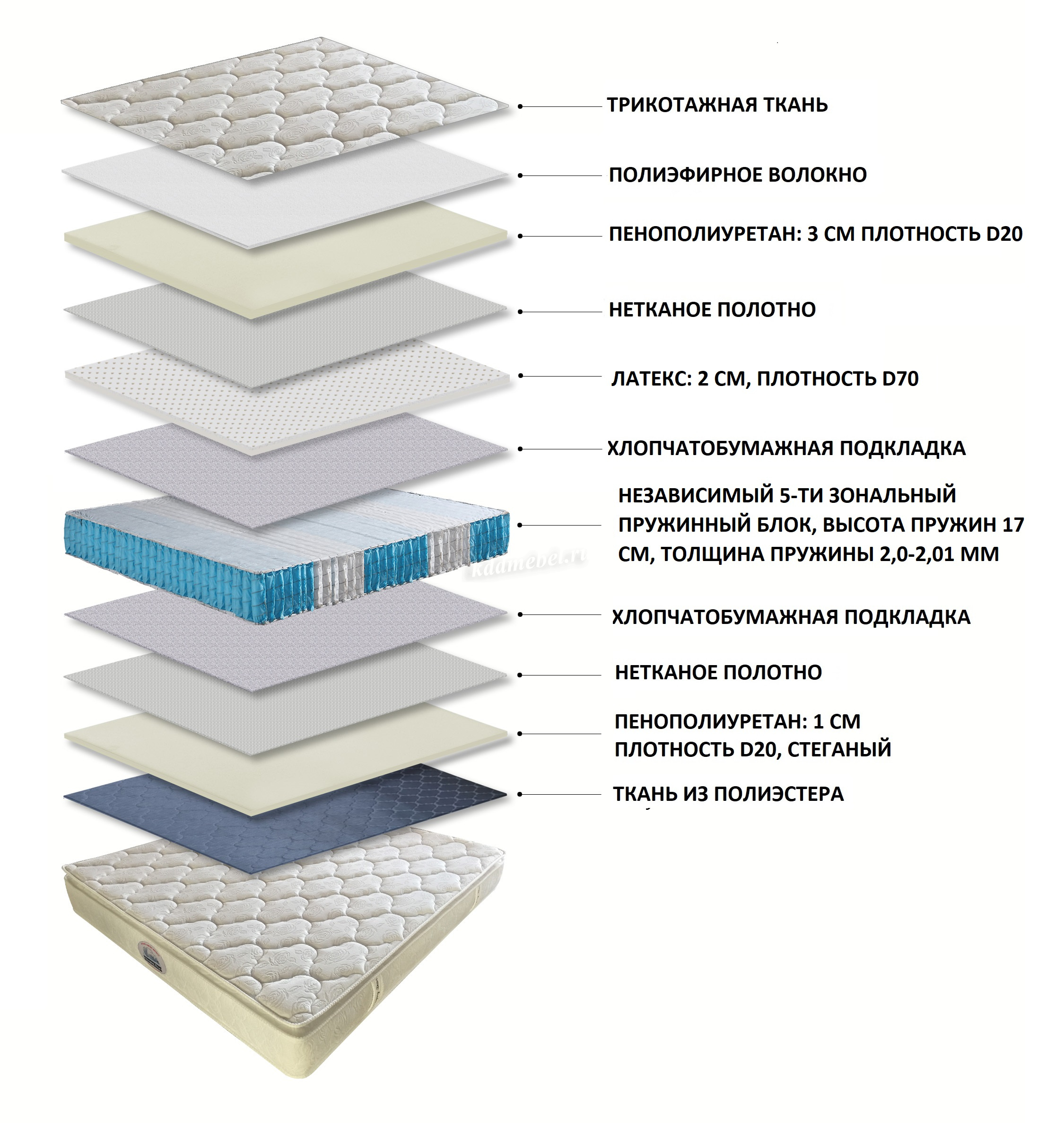 Слой натурального латекса: усиливает ортопедические свойства, материал легко подстраивается под контуры человека.