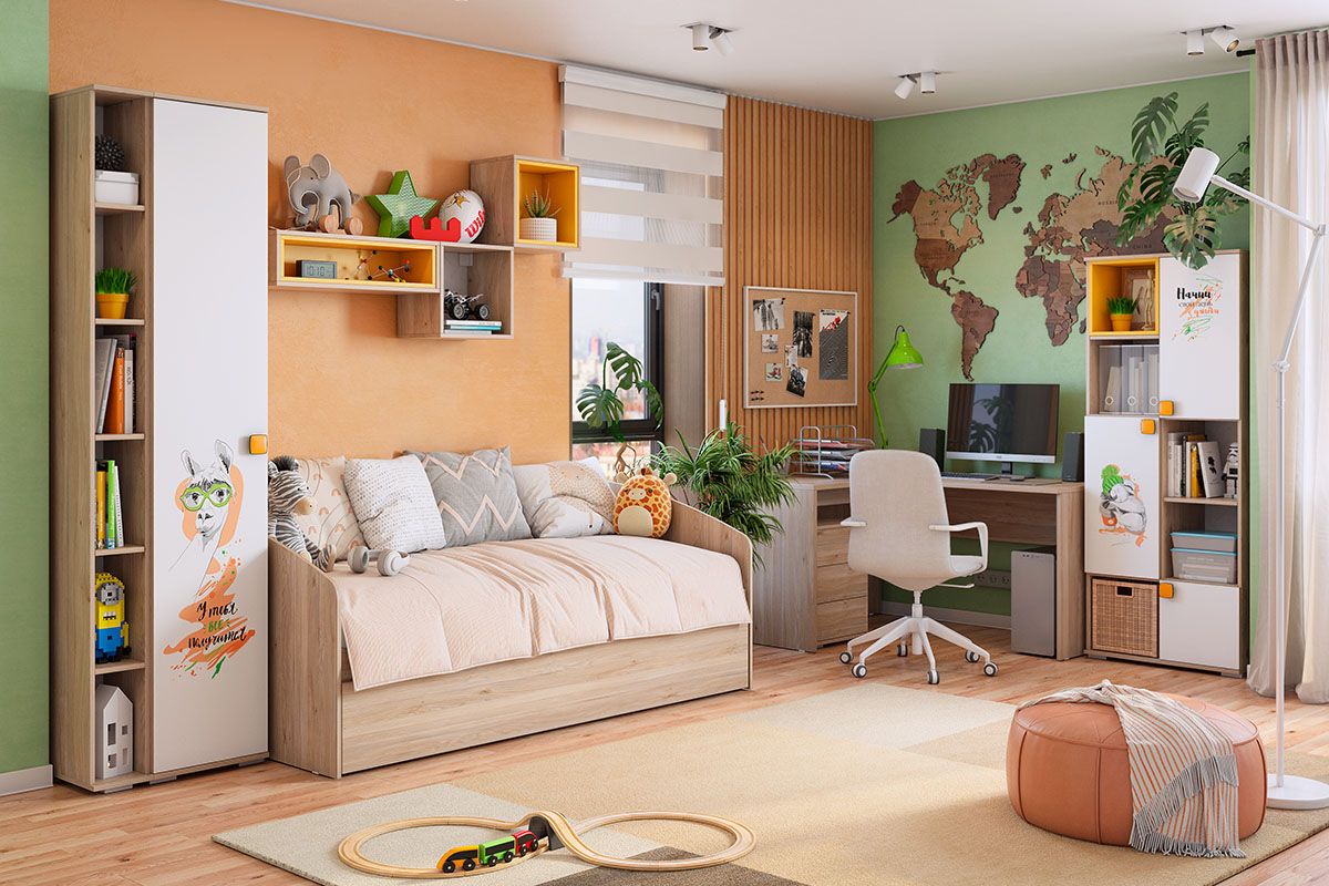 Модульная детская мебель Зоо - это позитивная и яркая коллекция, которая подходит, как для мальчиков, так и для девочек за счёт универсального принтерного рисунка. Модный и стильный рисунок на фасадах и яркая ручка, придадут индивидуальность детской комнате. Принтерный рисунок устойчив к истиранию и ультрафиолету. Цветовое сочетание и позитивные надписи благотворно влияют на нежную психику ребенку.