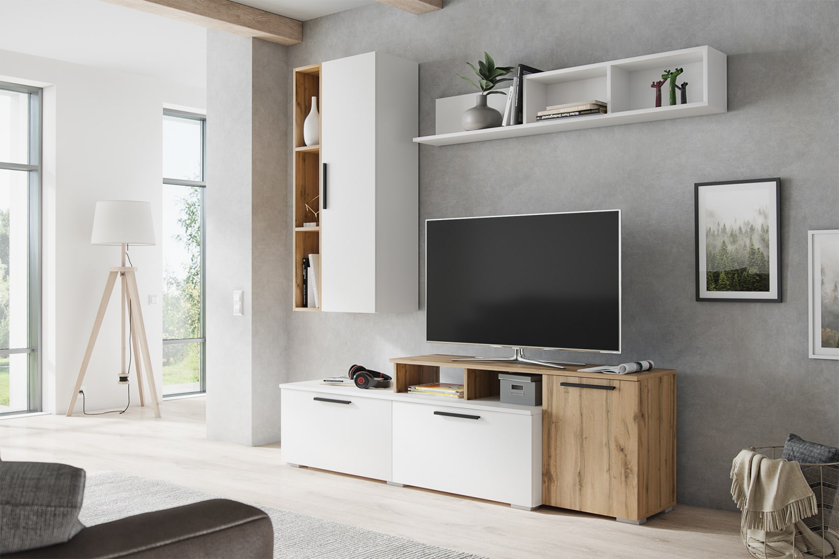 Ультрамодная и компактная гостиная Альберо станет украшением Вашего дома! Коллекция представлена навесными шкафами-пеналами, тумбами под ТВ-аппаратуру, открытыми стеллажами и навесной полкой. Благодаря разнообразию модулей Вы сможете расположить все Ваши вещи: бытовые мелочи, предметы декора, книги, технику и многое другое. Основным цветом мебели выступает белый: освежает интерьер помещения и визуально расширяет пространство. В сочетании с благородным стильным серым графитом белый цвет раскрывается по-новому.