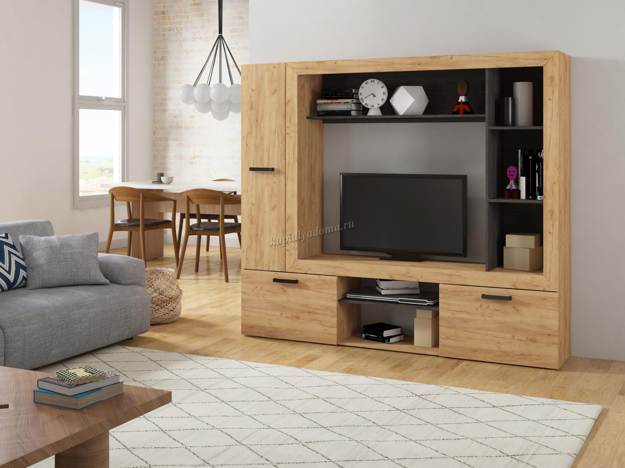Компактная гостиная для небольших помещений или для тех, кто не хочет заставлять комнату большими конструкциями. В Гостиной «Oskar-3» предусмотрены открытые и закрытые полки для хранения мелочей, бумаг, книг. Место для телевизора и аппаратуры. Закрытые отделения для хранения белья, а так же полка для сувениров и фотографий. Отличительной особенностью гостиной является багетная рамка, которая придает гостиной современный вид.