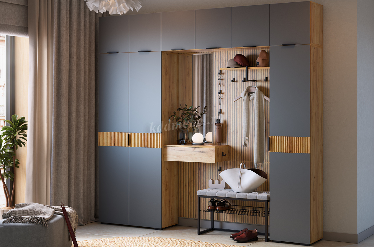 Принт, имитирующий вертикальную фрезеровку, придает зеркалу уникальный и современный вид, добавляя текстуру и глубину. Крючки предоставляют удобное место для хранения сумок или аксессуаров. Выкатной ящик служит дополнительным пространством для хранения мелочей, таких как ключи, кошелек, косметика или другие небольшие предметы.