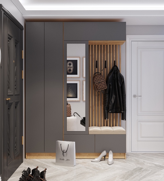 Состоит из функциональной центральной части, полноценного шкафа с полками и штангой, торцевого завершения. Все эти элементы объединяются в единую стильную и современную систему хранения для вещей.