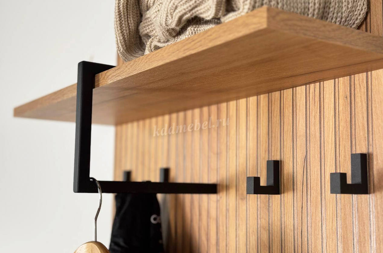Вешалка 1 "Бодрум" – стильное и функциональное решение для организации пространства в вашем доме. Эта вешалка сочетает в себе элегантный дизайн и практичность, идеально подходя для прихожей, спальни или гостиной. Принт, имитирующий вертикальную фрезеровку придает вешалке уникальный и современный вид, добавляя текстуру и глубину. Крючки предоставляют удобное место для хранения верхней одежды, сумок или аксессуаров. Держатель для плечиков позволяет организовать хранение одежды, сохраняя ее в идеальном состоянии. Полка служит дополнительным пространством для хранения головных уборов.