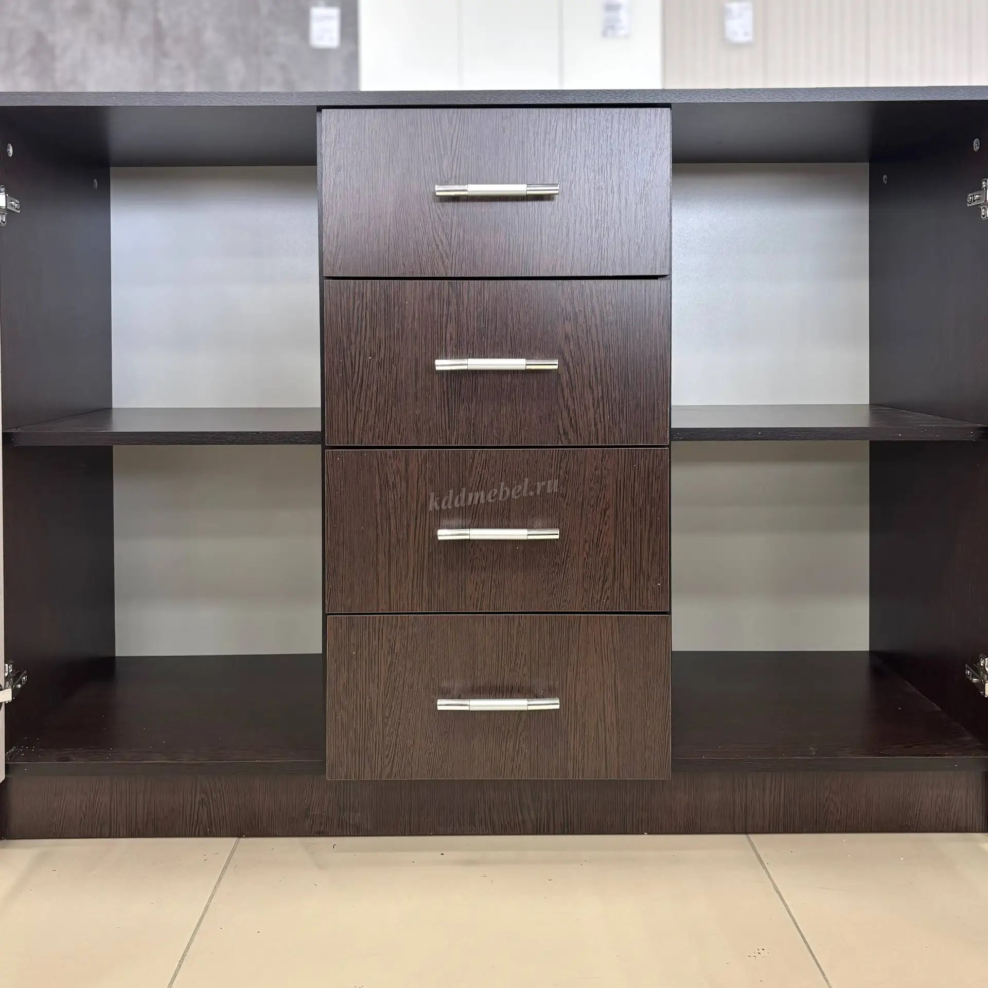 Комод имеет два больших отделения за распашными дверцами, разделенные внутри на 2 просторные полки. Посередине модели расположены четыре выдвижных ящика для разных мелочей. Дверцы открываются в сторону. Ящики выдвигаются на себя.